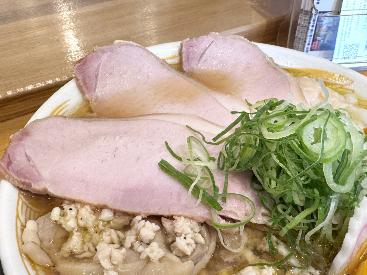 豚肉のチャーシューは柔らかく、親鶏のチャーシューは濃厚な旨味が魅力。