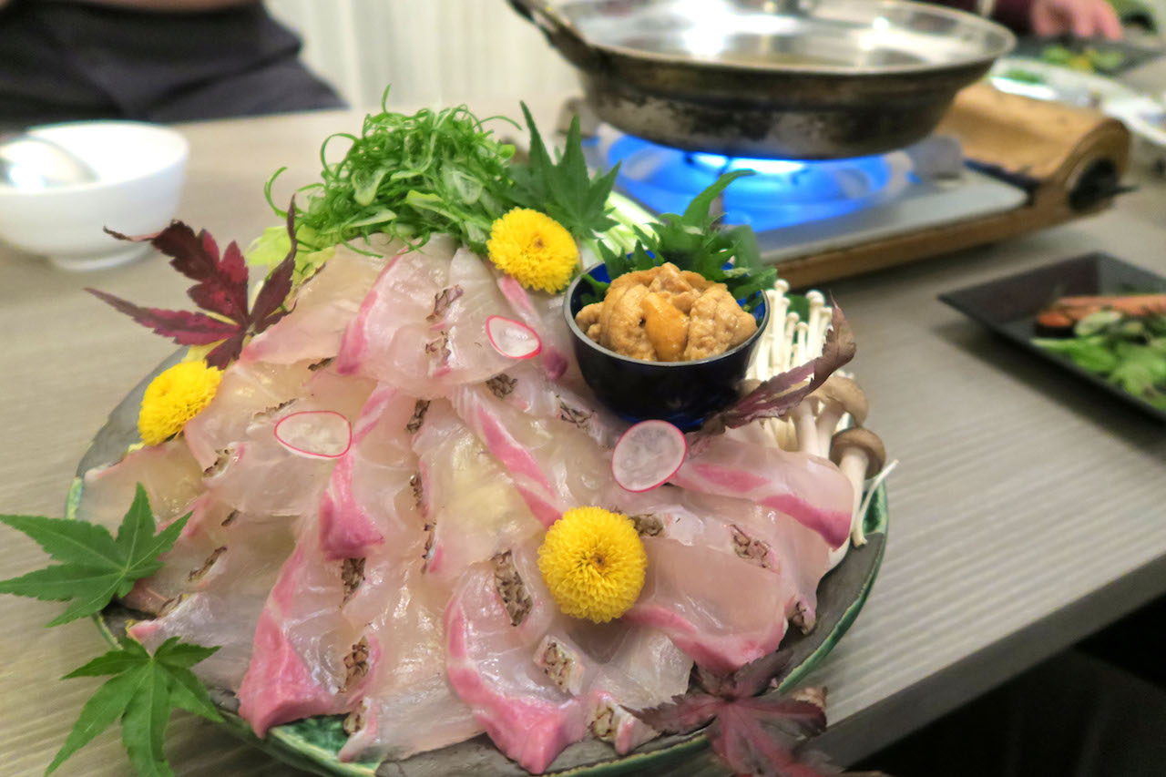 そんな感じで、ぶえん鰹を楽しんでいると、メイン料理の雲丹と鯛のしゃぶしゃぶが運ばれてきました。