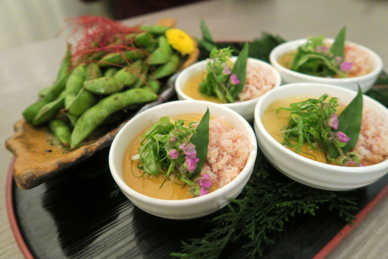 先ずは付きだしに、蟹のみがタップリ入った冷製茶碗蒸しと、枝豆。