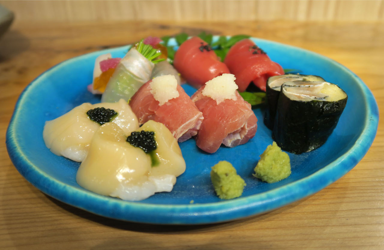 ヒラメ芽ネギ、本まぐろ、コハダ、キャビア帆立、